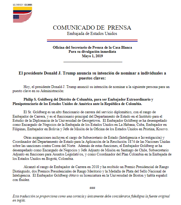 En caso de ser confirmado por la Cámara Alta, será la segunda vez que Goldberg ocupe un cargo diplomático en Bogotá, después de haber sido coordinador del «Plan Colombia» en la embajada estadounidense en ese país al inicio de su carrera.