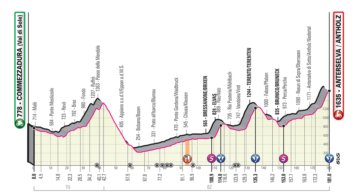 La etapa 17 tendrá montaña con 181 kilómetros de trayectoria entre Commezzadura y Anterselva con tres ascensos montañosos, uno de cuarta y dos de tercera, este último en la llegada. También la jornada tendrá dos sprints especiales en los kilómetros 108 y 153.