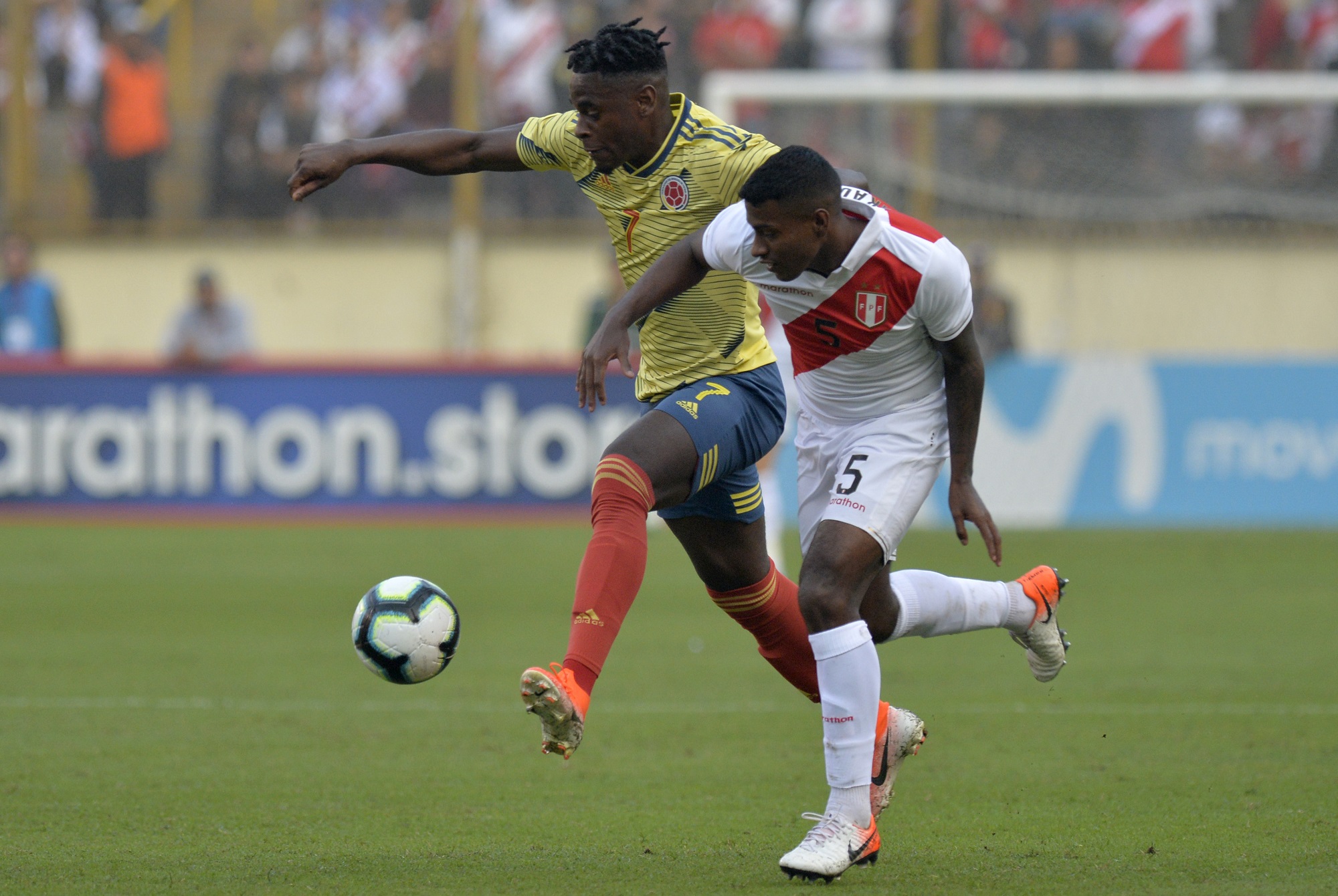 El primer gol llegó a través de Mateus Uribe, quien recibe un centro por izquierda y cabecea sin problemas para vencer a Pedro Gallese. A pesar de la polémica de que, si estuvo adelantado o no, el árbitro principal terminó por cobrar el primero a los 23 minutos.