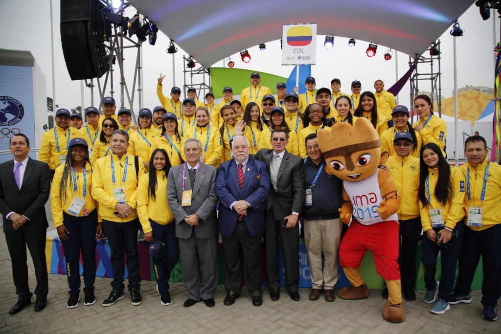 Finalizado su discurso, los Cadetes de la Fuerza Aérea y la Marina de Perú izaron el Pabellón Nacional y fue entonado con tal orgullo por nuestra delegación, el himno nacional. Luego del acto protocolario, el jefe de misión, Rafael Lloreda recibió de manos del alcalde, Giorgio Mautino, un cuchimilco, una estatuilla preincaica de la cultura chancay, e imagen representativa de los Juegos Panamericanos Lima 2019. Por su parte, el Jefe de Misión de Colombia hizo entrega de un retablo de imágenes precolombinas en relieve y el producto insigna de nuestro país, el café colombiano.