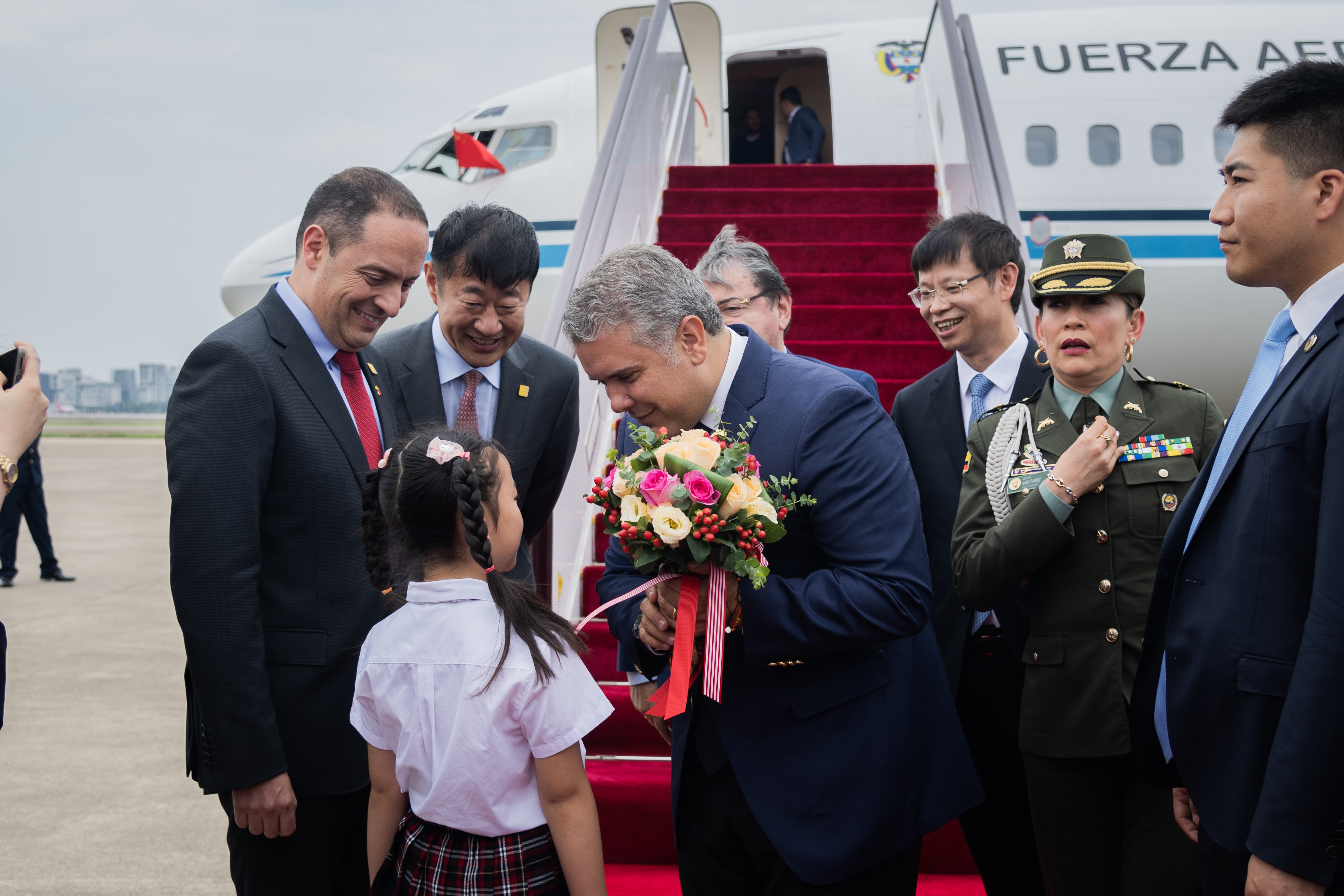 A su llegada a Shangái, China, el Presidente Iván Duque fue recibido con flores por una pequeña. Fotografía: Nicolás Galeano – PRESIDENCIA