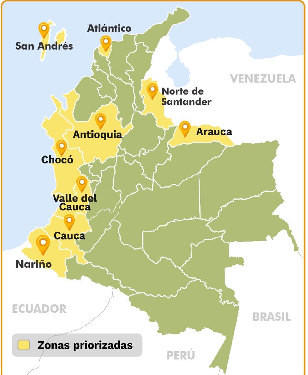Departamentos con mayor número de municipios advertidos: Antioquia, Chocó, Bolívar, Sucre, Nariño, Norte de Santander, Cundinamarca, Cauca, La Guajira, Meta y Valle del Cauca.