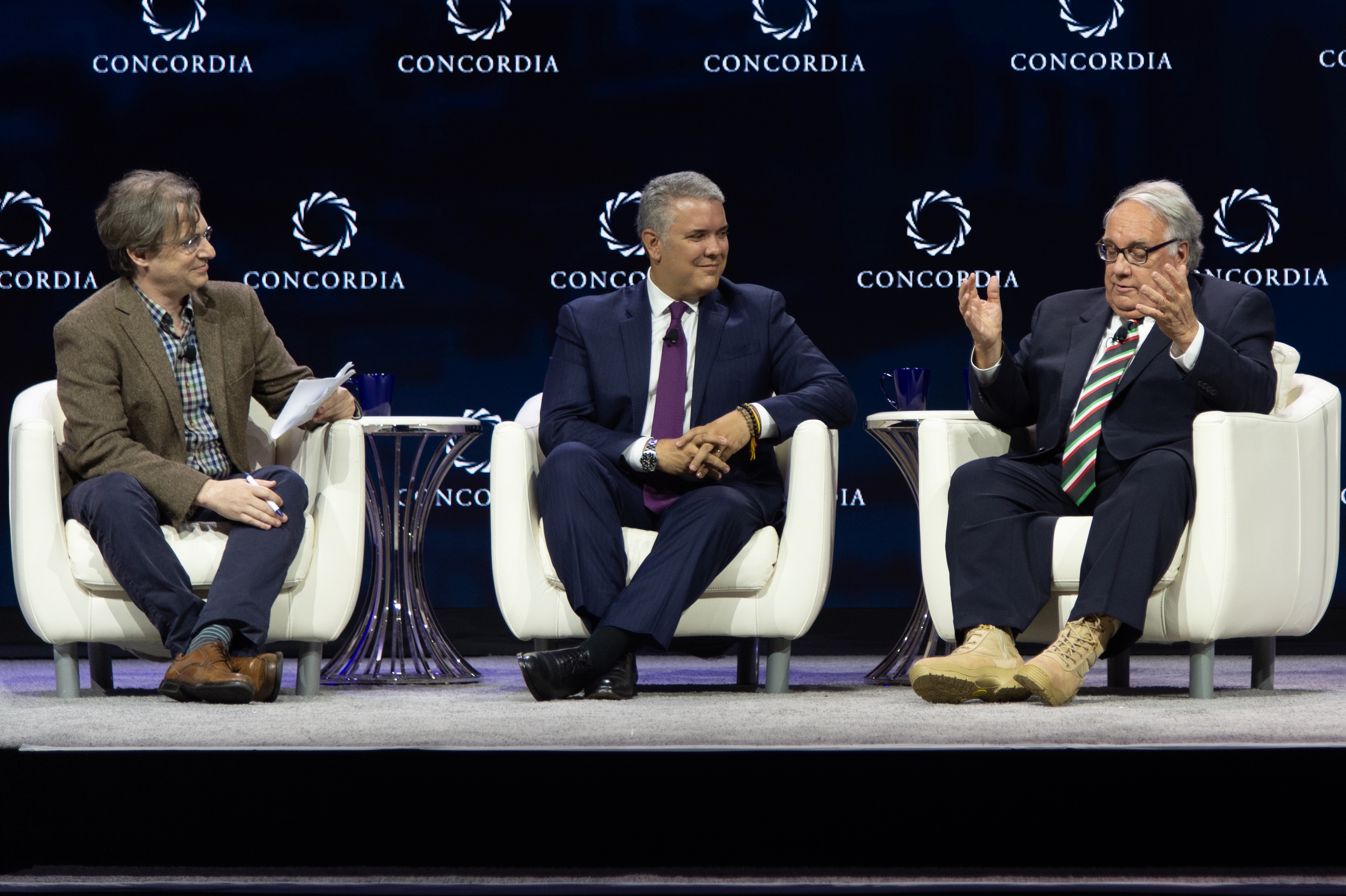 Buffet estaba sentado al lado del Presidente Iván Duque Márquez, durante un diálogo moderado por el periodista Joshua Goodman sobre cómo el sector privado puede participar en la construcción y el sostenimiento de la paz.