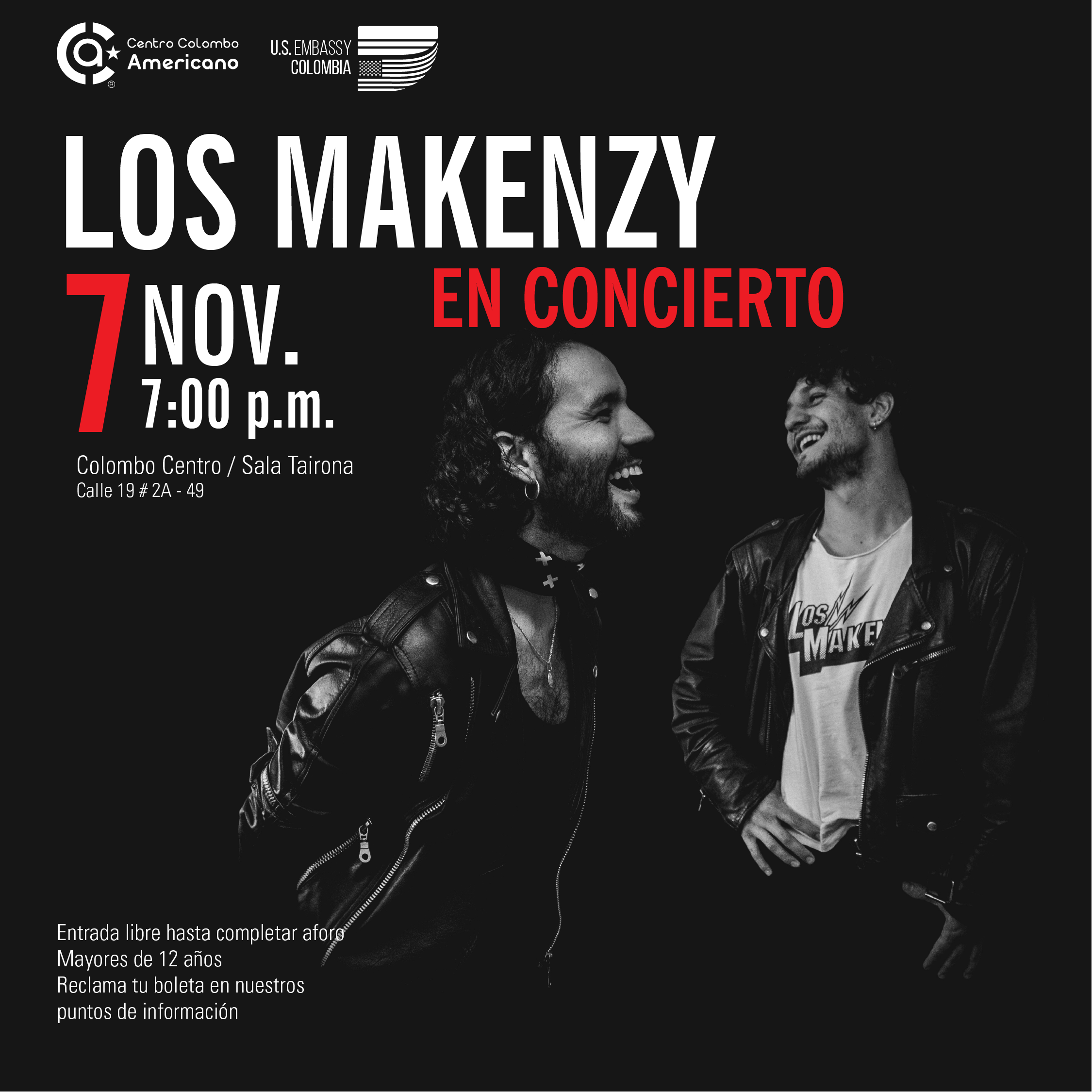 Andrés y Nicolás Makenzy son dos hermanos bogotanos que hacen música desde que tienen memoria. En 2014 crearon su banda y en 2016 lanzaron su primer álbum Homónimo, una mezcla de rock alternativo con ritmos latinos, dance y blues, que hacen parte de su sello particular. Desde ese momento han compartido escenario con artistas como Robi Draco Rosa, Quees Of The Stone Age, Catfish y The Bottlemen. Además, han participado en festivales como Rock al Parque, Breakfest y Cosquin, Día del Rock en Colombia, Estéreo Picnic 2017 y se presentarán en la edición 2020 de este festival.