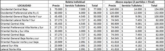 Los precios de boletería oscilan entre $23.000 y $77.000 y las boletas pueden adquirirse tanto en forma individual, como en abonos de dos partidos por equipo que incluyen acceso a la gran final.