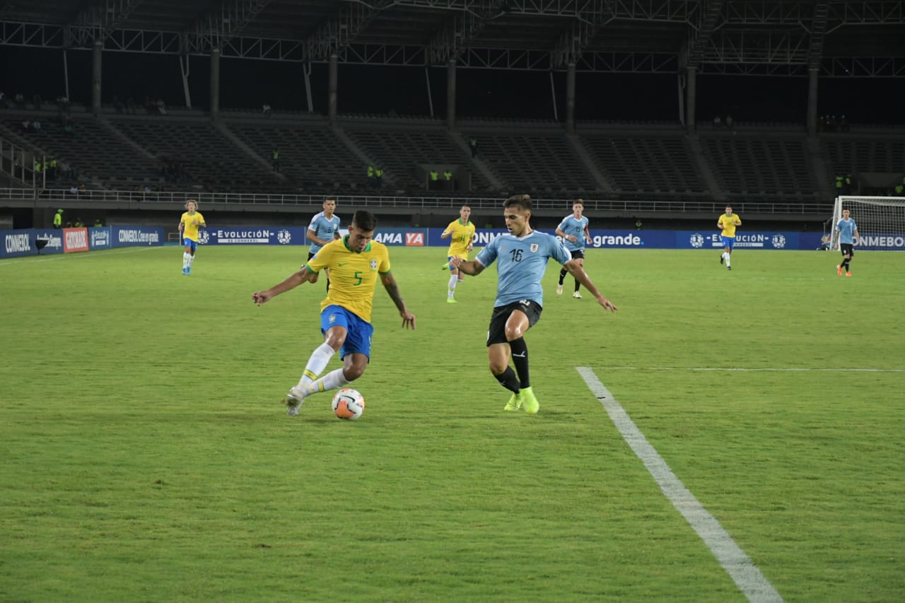 El fútbol es práctico y no basta con tener la pelota sino con ser contundente y saber qué hacer con ella. Pues eran los celestes los que la tenían pero los brasileros hicieron daño en la primera que tuvieron. Fue así como al minuto 15, Antony Matheus Dos Santos atacaba por la zona de oriental y envío un gran pasegol a Pedro Victor Delmino Da Silva quien frente al arco venció la resistencia del portero De Arruabarrena y puso el 1-0 para la ‘Canarinha’.