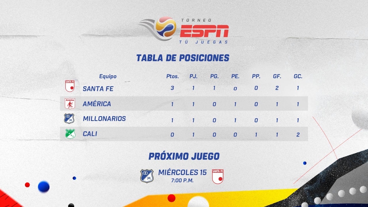 Santa Fe es líder parcial del torneo con 3 puntos, tras el empate de Millonarios y América 1-1 en la primera jornada del campeonato amistoso.