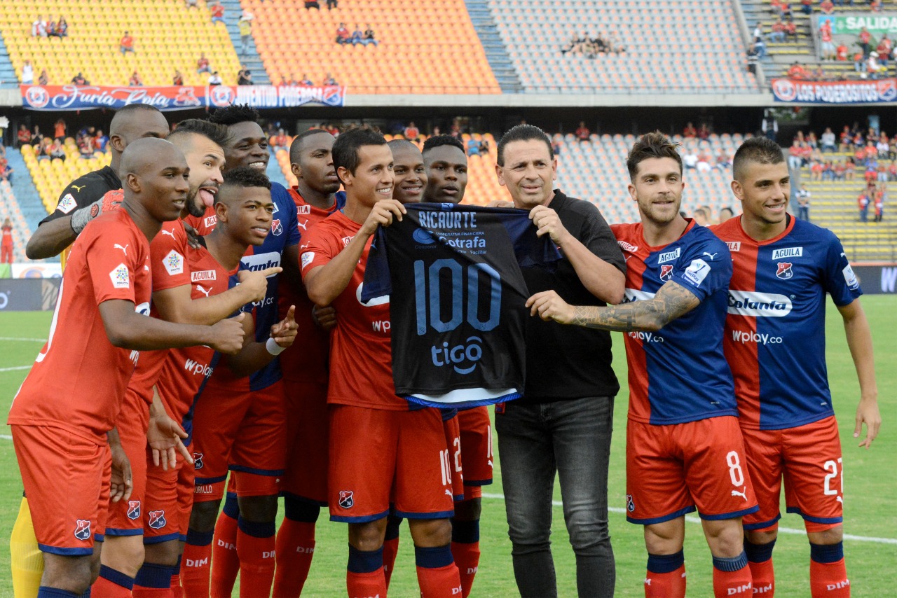 Andrés Ricaurte completó 100 partidos con la casaca del ‘poderoso’, acá recibe la camisa conmemorativa de parte del gerente deportivo Juan Bernardo Valencia y todos sus compañeros titulares de hoy.