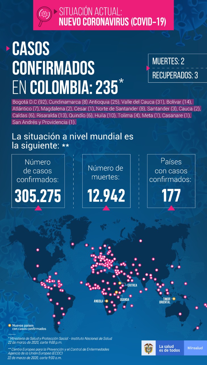 El Ministerio de Salud confirmó este domingo 25 nuevos casos de coronavirus en Colombia. Con ellos, en el país la cifra se eleva a 235. Además, confirmó una segunda muerte por el virus SARS-Cov-2.