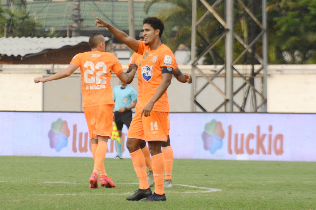 Jairo Palomino (14) anotó el segundo gol para el conjunto naranja. Acá lo dedica a la tribuna, muy cerca Néyder Moreno, autor del primero.