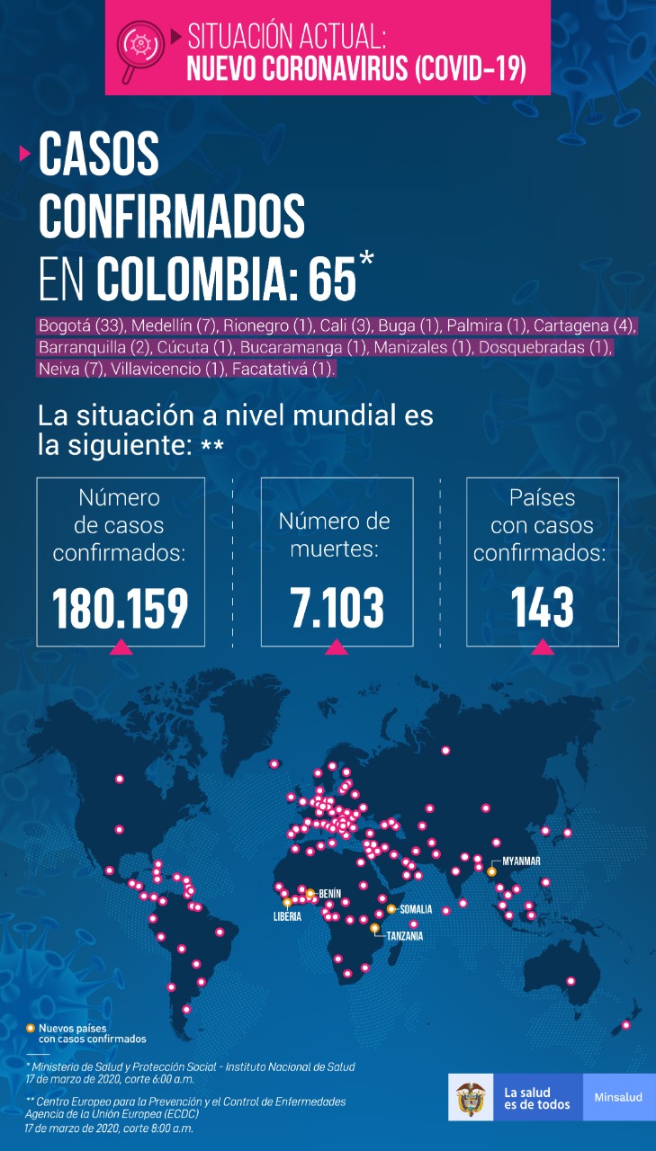Bogotá, 17 de marzo_ RAM_ El Ministerio de Salud confirmó nueve nuevos casos de coronavirus en el país. Lo que elevó la cifra de contagiados a 65.