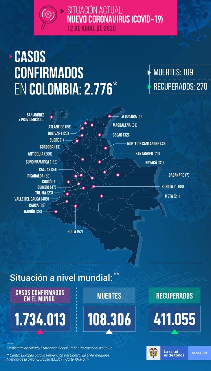 Bogotá, 12 de abril_ RAM_ Otros 67 contagios de Covid-19 en el país fueron confirmados en el último reporte del Ministerio de Salud de este domingo, elevando el número de afectados a 2.776. Asimismo, se confirmaron nueve nuevos fallecimientos, por lo que esta cifra acumulada se eleva a 109.