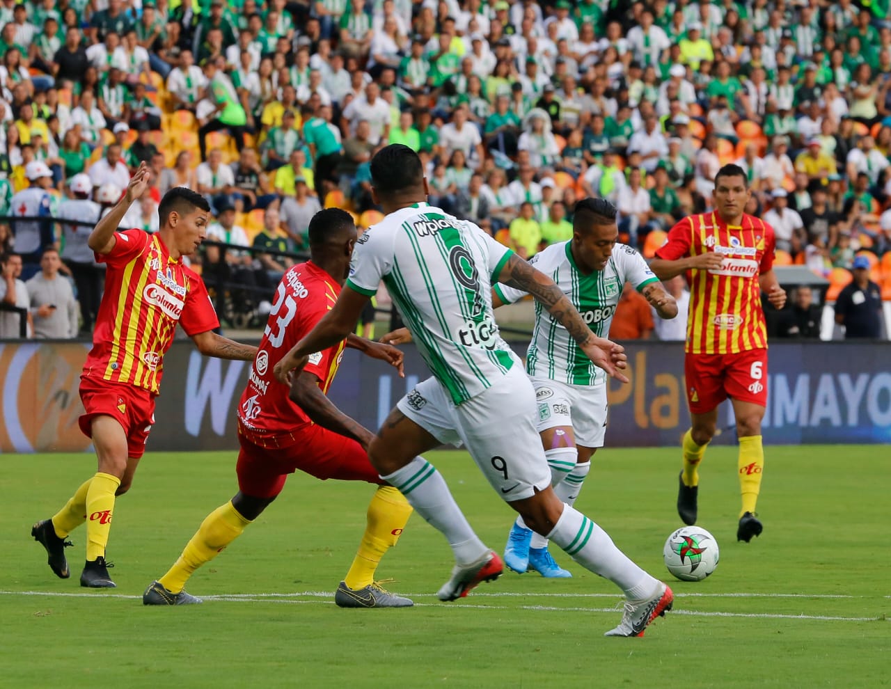 Sebastián Gómez transporta el balón ante la mirada de Duque (9), González (23), Ordóñez (6) y Jorge Posada.Foto Wilson Valencia