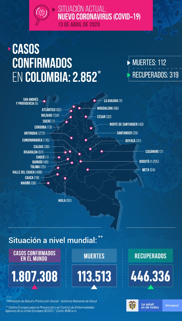 Bogotá, 13 de abril_ RAM_ 76 contagios de Covid-19 en el país fueron confirmados en el último reporte del Ministerio de Salud de este lunes, elevando el número de afectados a 2.852. Asimismo, se confirmaron tres nuevos fallecimientos, por lo que esta cifra acumulada se eleva a 112.