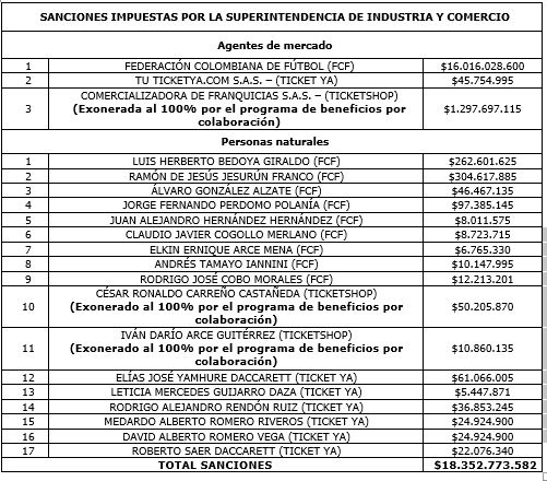 Bogotá, 06 de julio_ RAM_ La Superintendencia de Industria y Comercio sancionó a la Federación Colombiana De Fútbol (FCF), TU TICKET YA.COM S.A.S (TICKET YA) y comercializadora de franquicias S.A. (TICKETSHOP) por cartelización en la comercialización de la boletería para los partidos de fútbol, en condición de local, de la Selección Colombia en las eliminatorias al Mundial Rusia 2018.