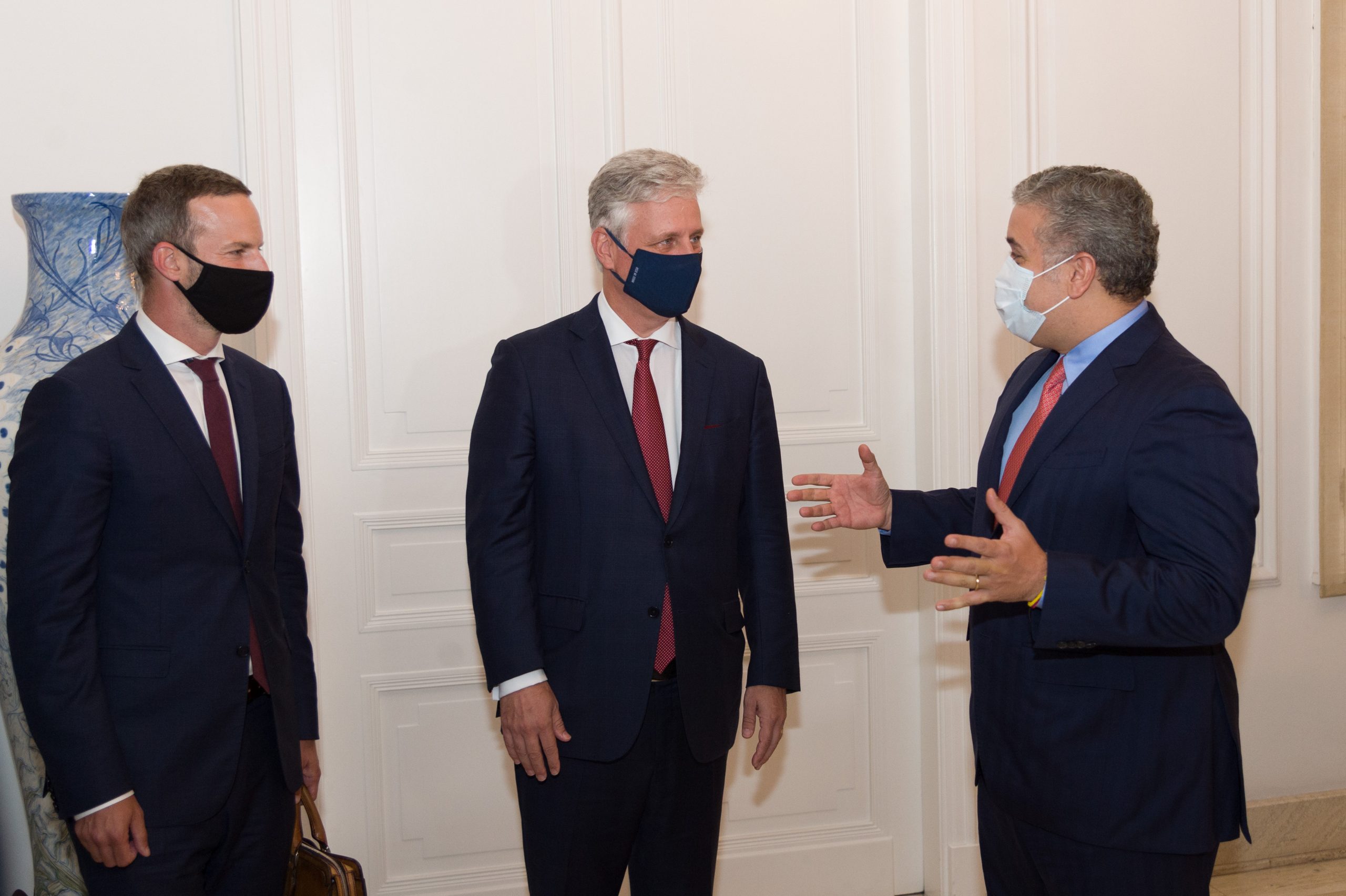 El presidente de Colombia, Iván Duque (derecha), habla con el asesor de seguridad nacional de Estados Unidos, Robert O’Brien (centro), y el director general de la Corporación Financiera Internacional de Desarrollo de Estados Unidos, Adam Boehler (Iizquierda), antes de una reunión en el Casa de Nariño.-Foto PRESIDENCIA