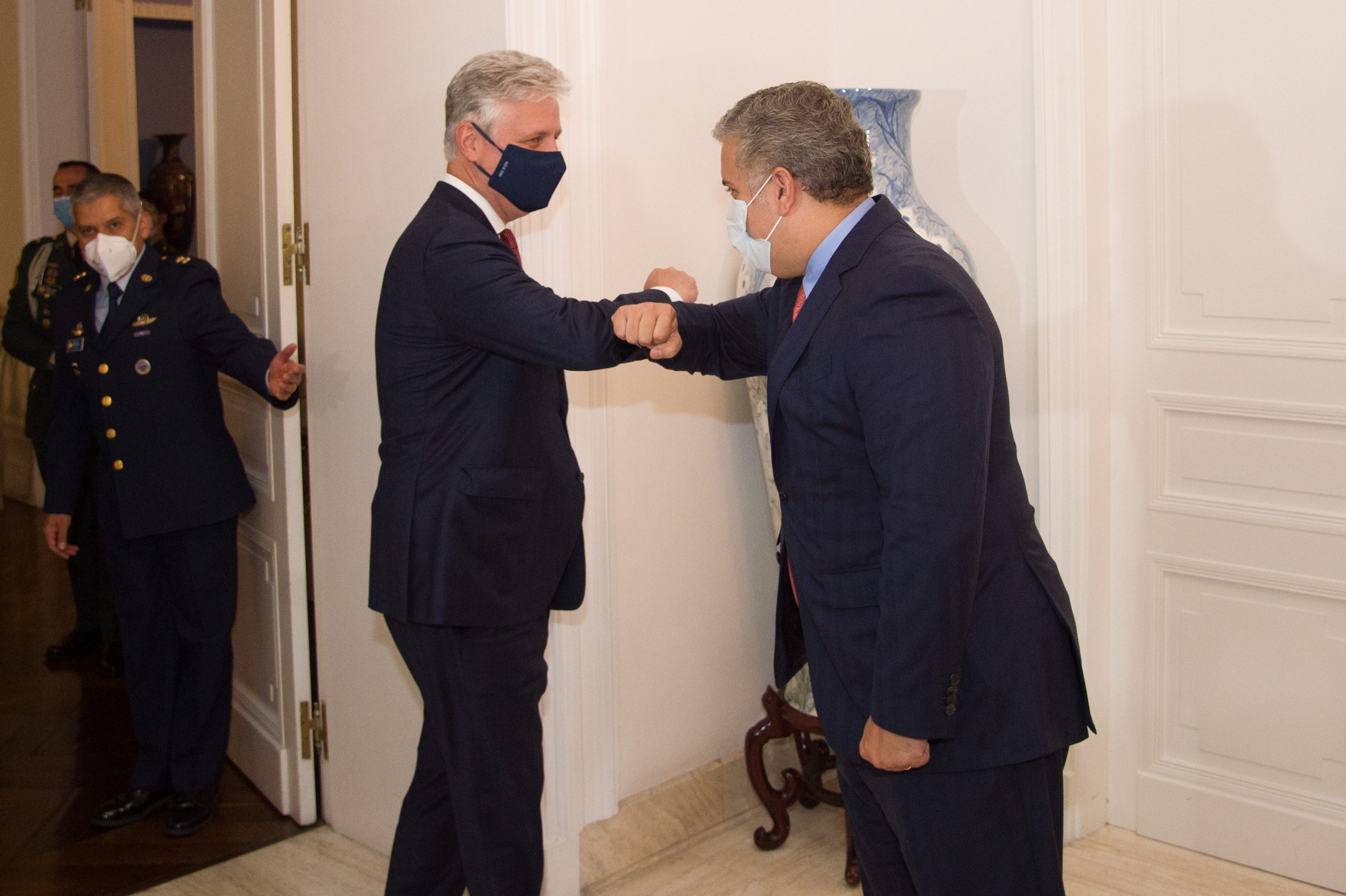 El Presidente de la República, Iván Duque Márquez, recibe el saludo del Asesor de Seguridad Nacional de EE.UU., Robert O’Brien, quien encabezó la delegación de ese país que llegó este lunes a Bogotá para reunirse con el Mandatario.Foto Presidencia