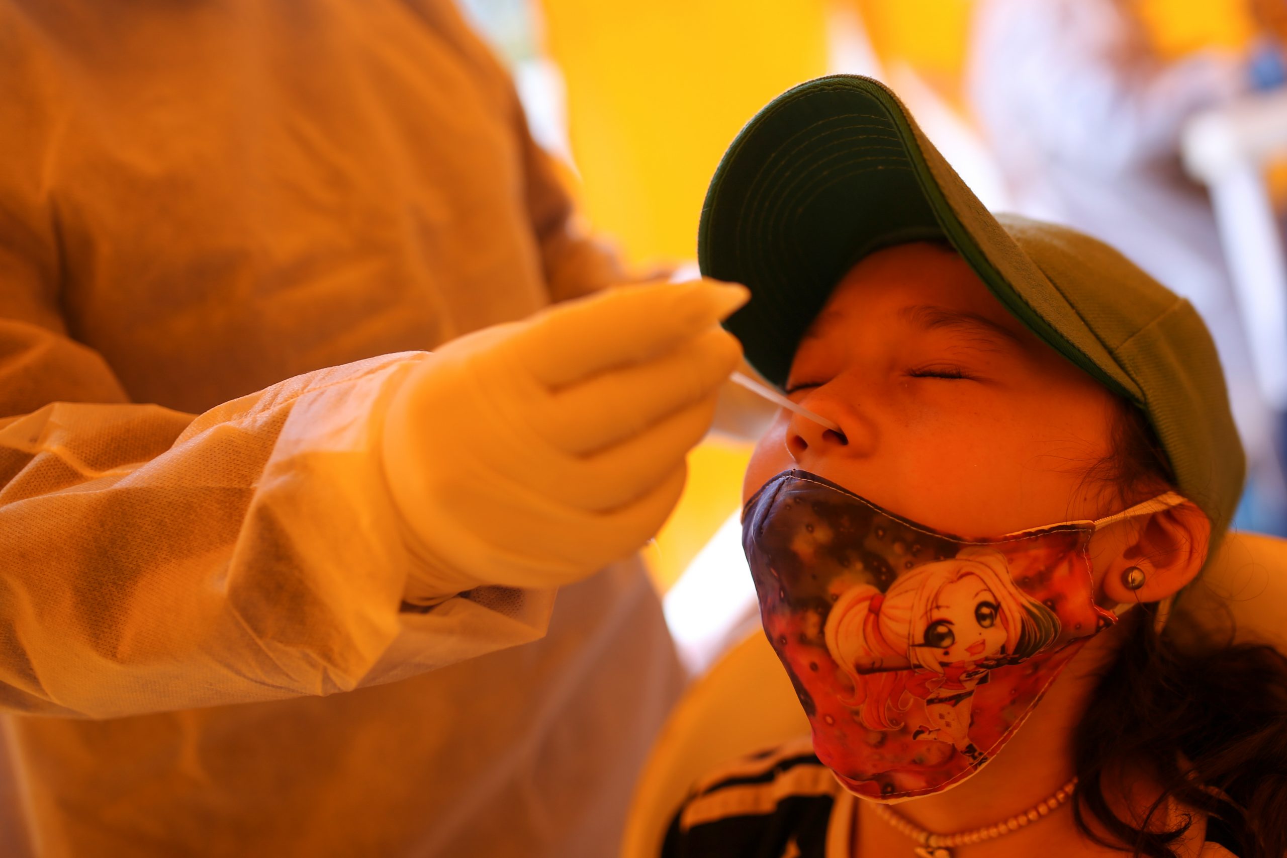 Un miembro de un equipo médico toma una muestra a una niña para detectar COVID-19 en una de las zonas con más infecciones en Bogotá, REUTERS/Luisa González