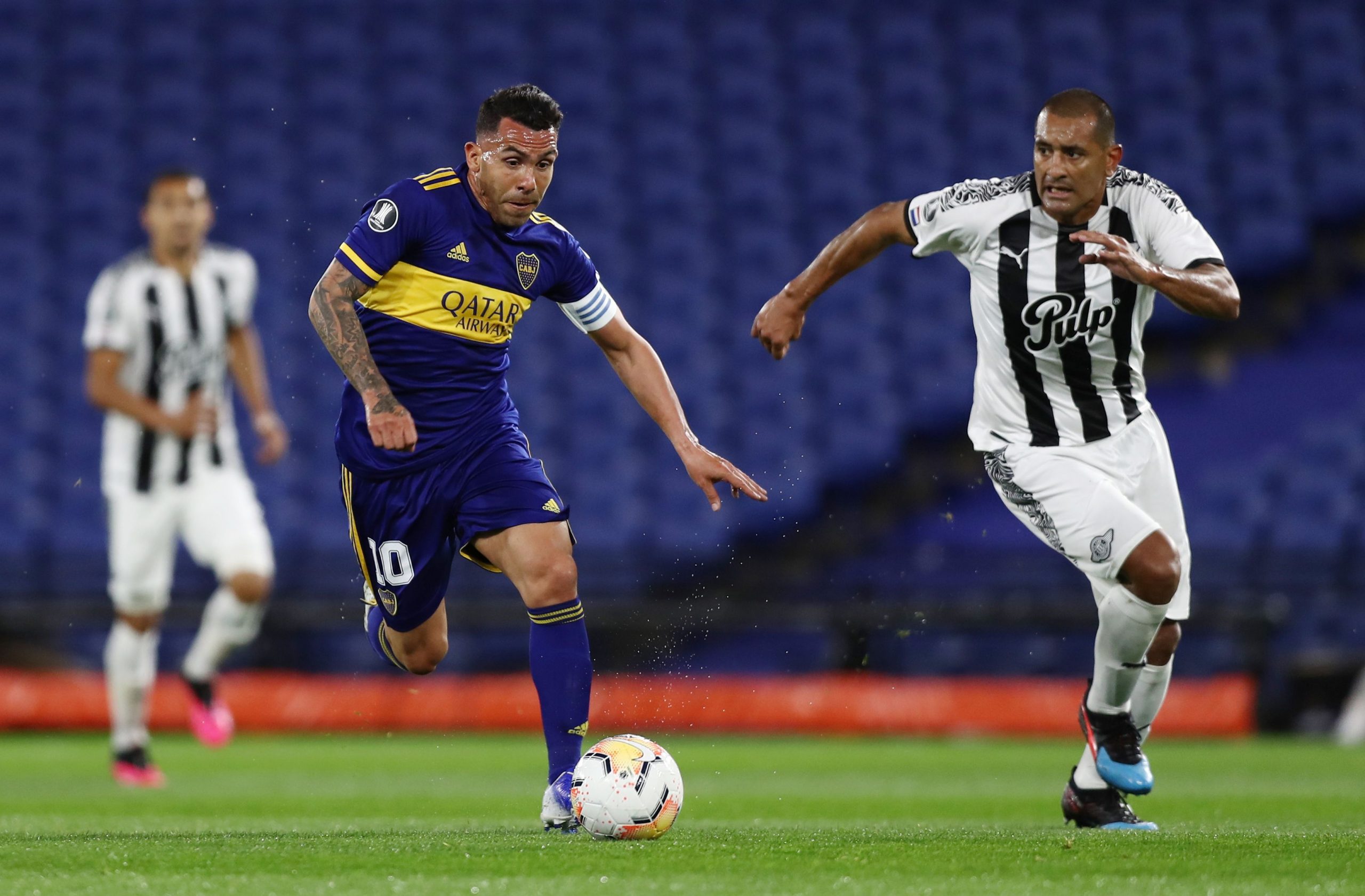 Carlos Tévez de Boca Juniors en acción con Paulo da Silva del Libertad. Pool via REUTERS/Agustin Marcarian