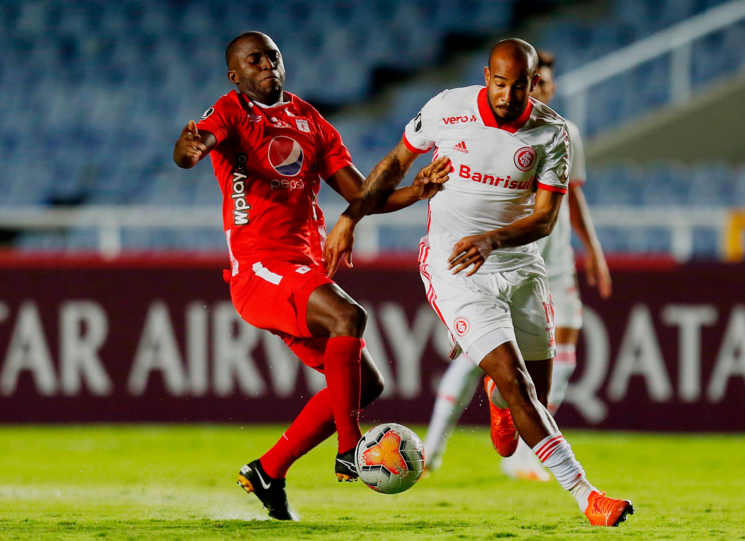 Emmerson Batalla del América en acción con Patrick del Internacional. Pool via REUTERS/Ernesto Guzmán Jr.
