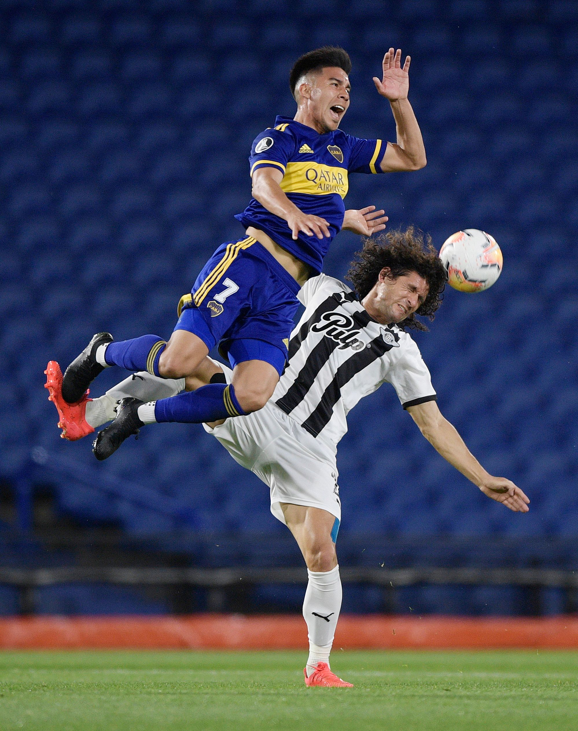Pol Fernández de Boca Juniors en acción con Antonio Cáceres del Libertad. Pool via REUTERS/Juan Mabromata