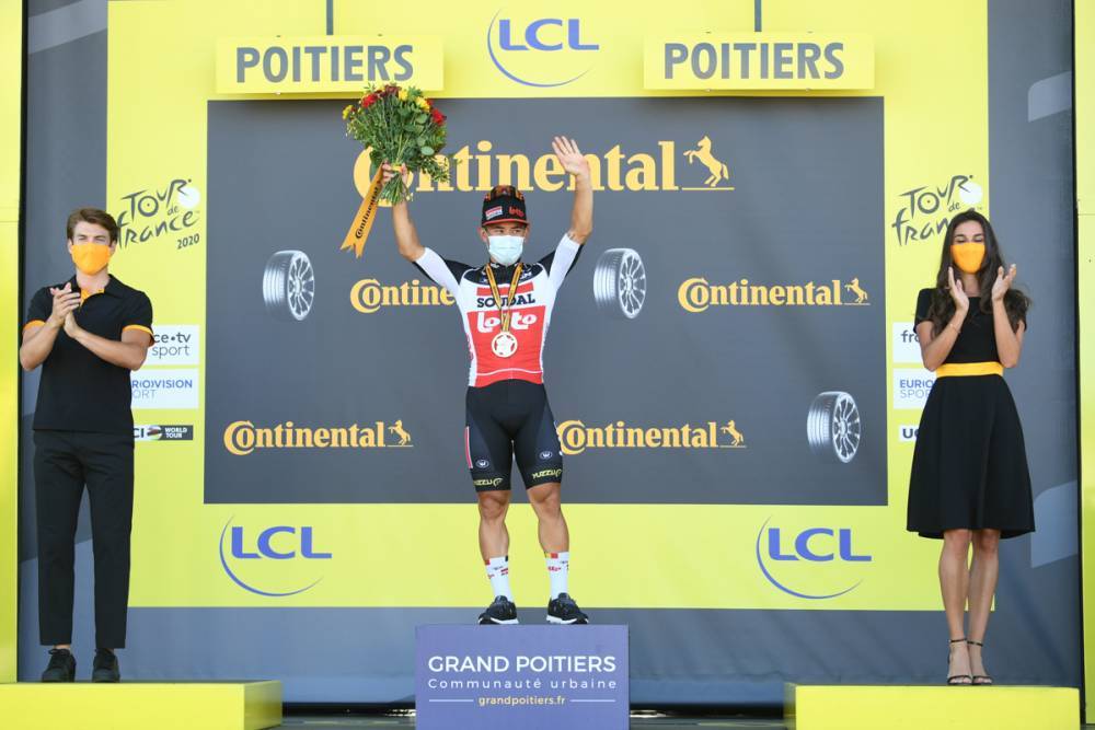 Fue a 6 del final que Lukas Pöstlberger (Bora-Hansgrohe) arrancó, tratando de sorprender al pelotón. Se unieron a su tentativa Kasper Asgreen y Bob Jungels (Deceuninck-Quick Step). El trío logró fraguar siete segundos de ventaja, pero fue cazado a dos kilómetros de meta por un pelotón frenético en busca de la ‘volata’ en Poitiers.