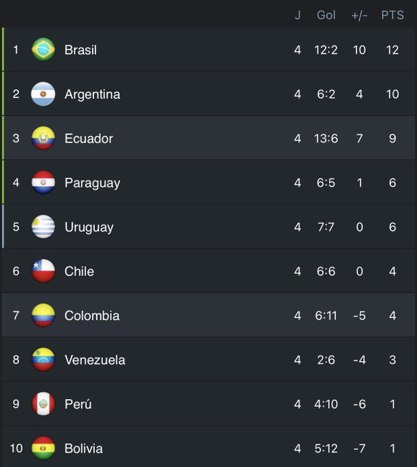 Con este resultado, Ecuador trepó a los primeros puestos de la tabla con nueve puntos en cuatro partidos, mientras que Colombia se quedó con cuatro unidades tras sufrir la goleada en Quito y el 3-0 en casa ante Uruguay en la fecha pasada.