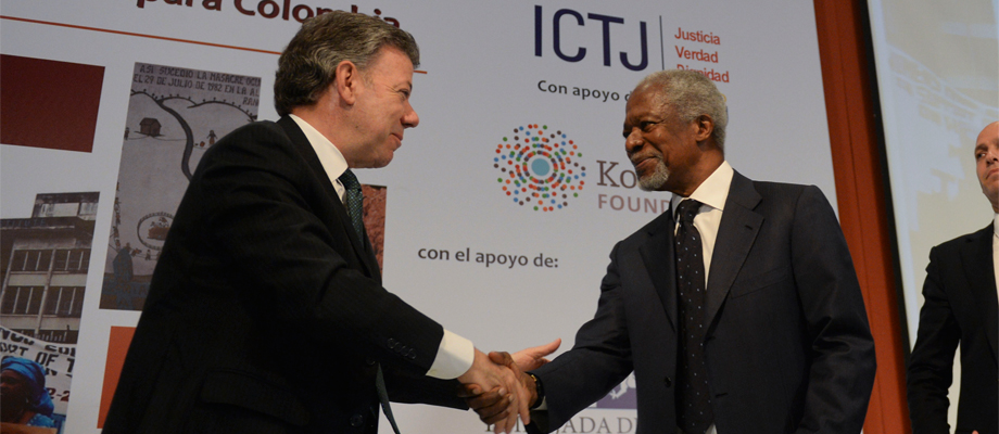 Presidente Santos y Kofi Annan se saludan en el foro ‘Comisiones de la Verdad y Proceso de Paz