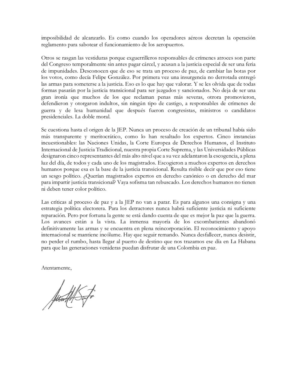 En la misiva, Santos indica que tanto este acuerdo omo la Jurisdicción Especial para la Paz (JEP) están blindados por la ley y la Constitución Política, hecho por el cual los anuncios hechos recientemente por un sector político no tienen futuro puesto que no se puede modificar lo acordado tras el proceso de paz que se llevó a cabo en La Habana (Cuba).