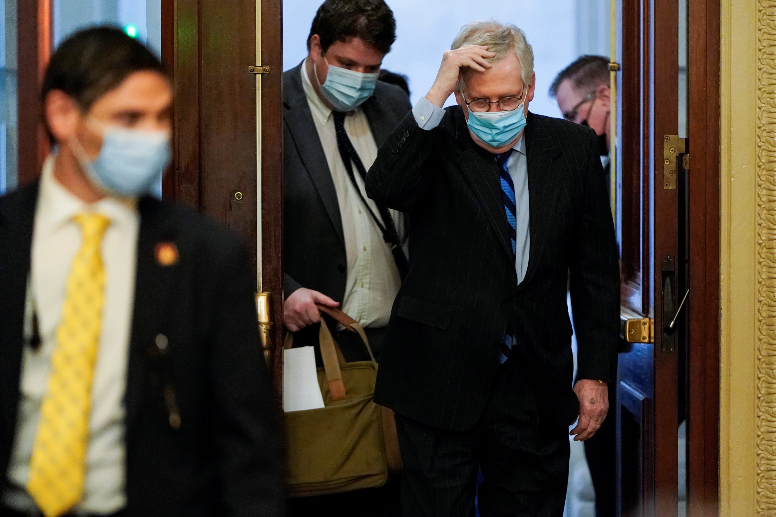 El líder de la mayoría del Senado de los Estados Unidos, Mitch McConnell, llega antes de una votación final sobre la anulación del veto a la Ley de Autorización de Defensa Nacional en el Capitolio, Washington, EEUU, 1 enero 2021. REUTERS/Joshua Roberts