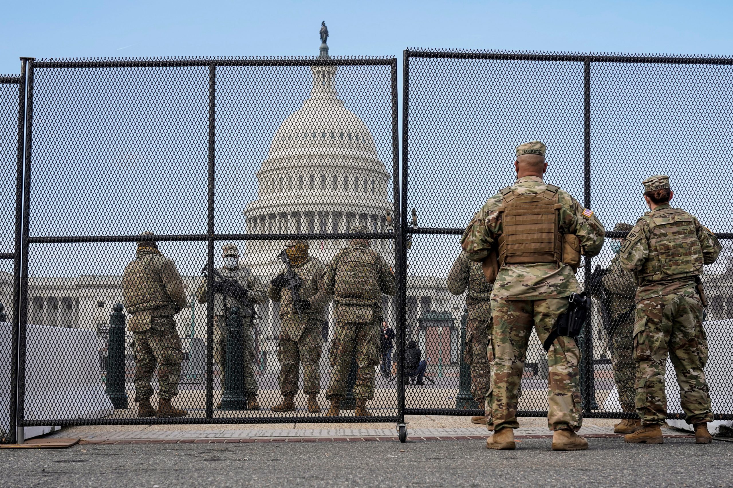 Soldados de la Guardia Nacional vigilan el Capitolio de Estados Unidos después de que la Cámara de Representantes destituyó al presidente de Estados Unidos, Donald Trump, en Washington. 14 de enero de 2021. REUTERS/Joshua Roberts
