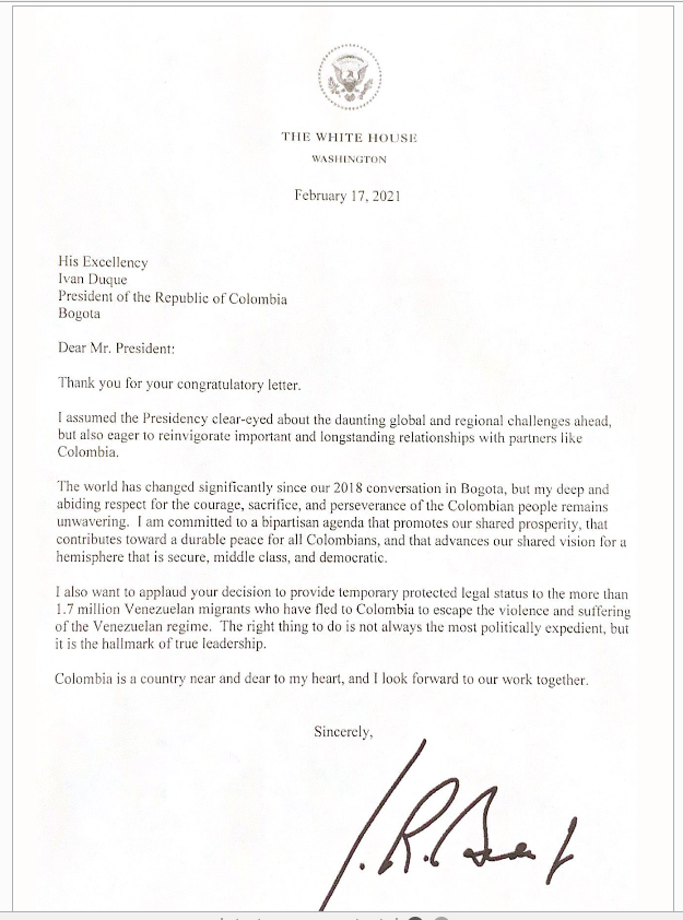 La carta, enviada el 17 de febrero, Biden asegura que anhela reforzar las largas relaciones bilaterales que tiene con aliados regionales como Colombia para hacer frente a los retos que tiene la región.