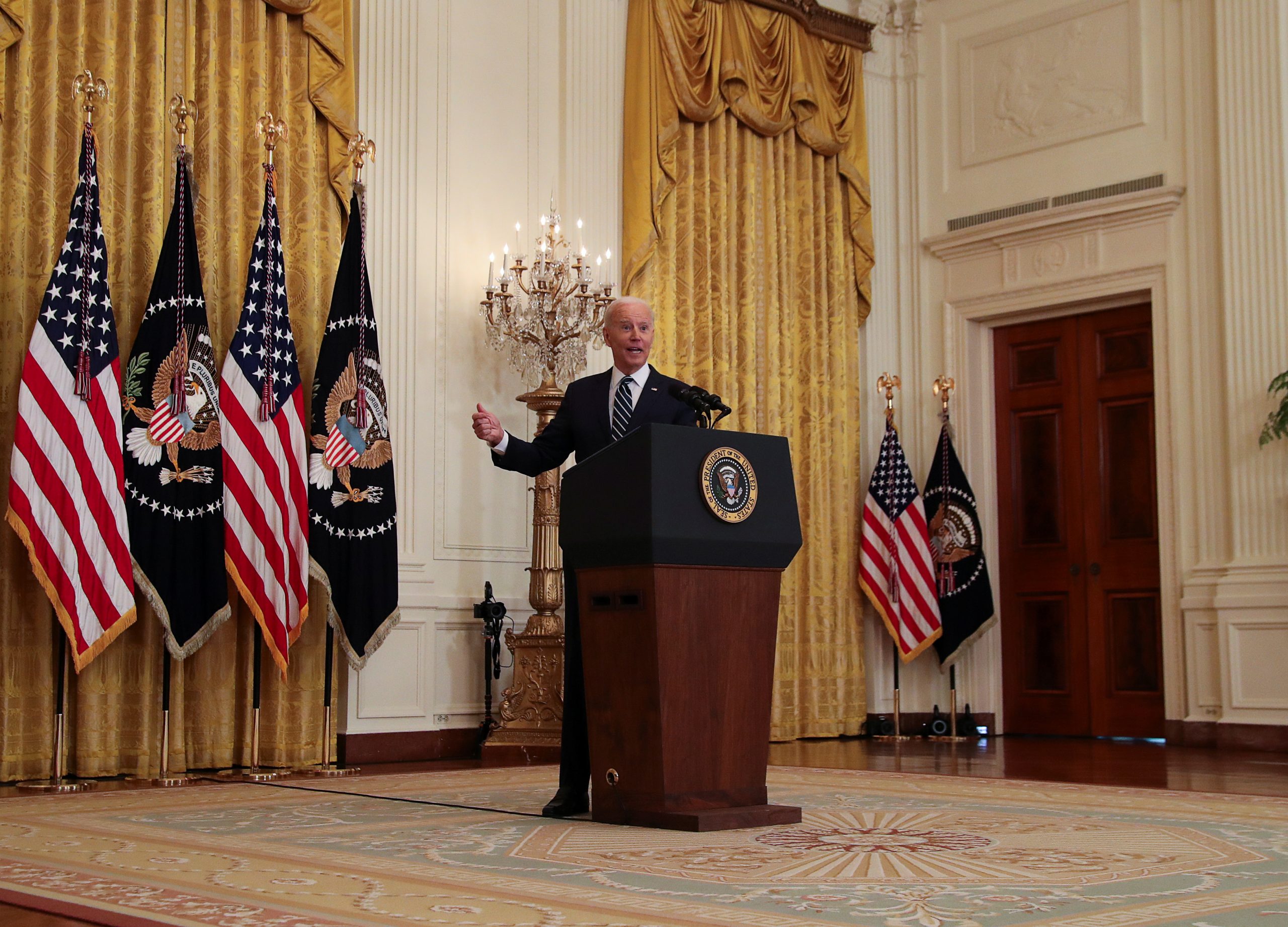 El presidente de Estados Unidos, Joe Biden, responde preguntas mientras realiza su primera conferencia de prensa formal en el Salón Este de la Casa Blanca en Washington, Estados Unidos, el 25 de marzo de 2021. REUTERS/Leah Millis