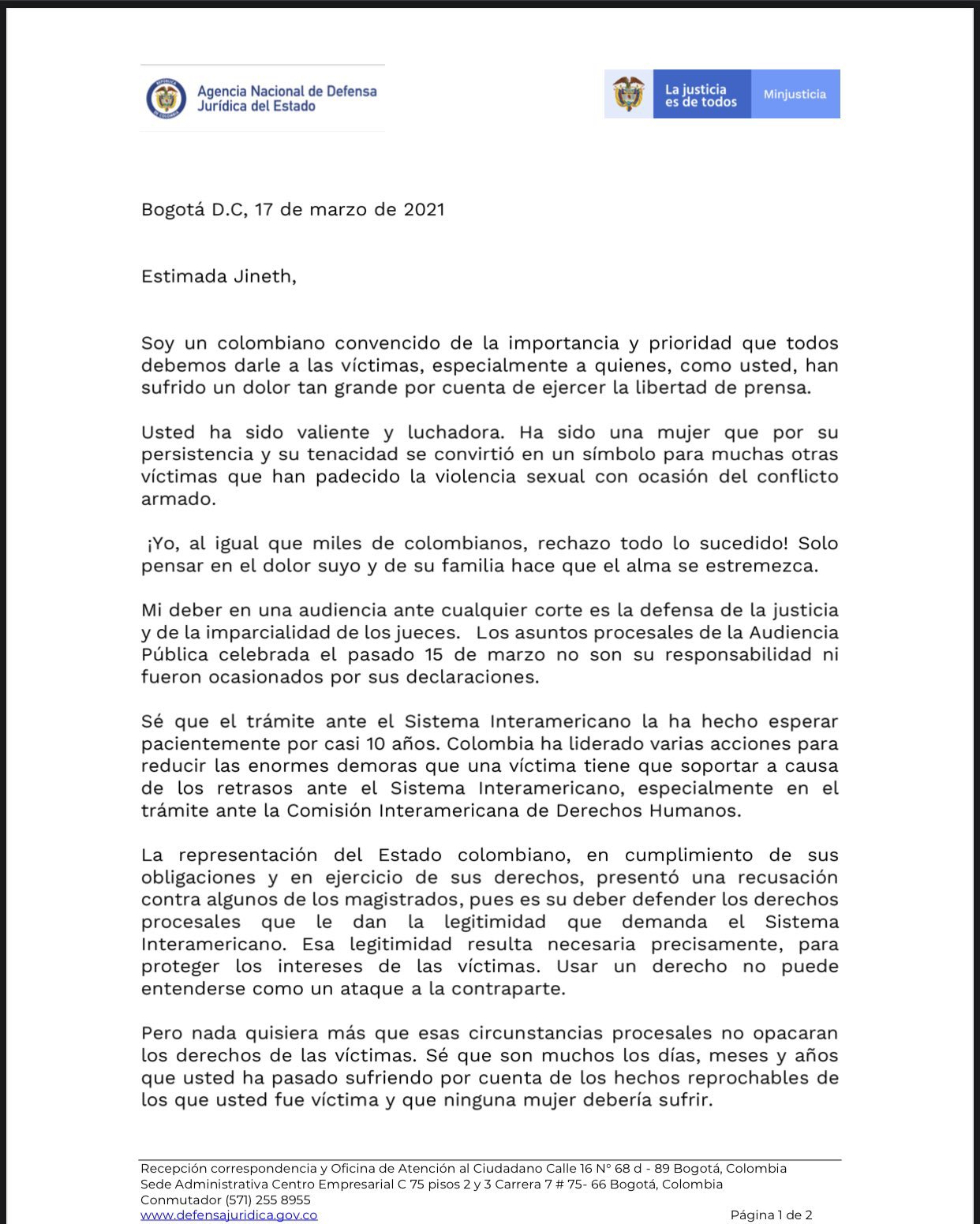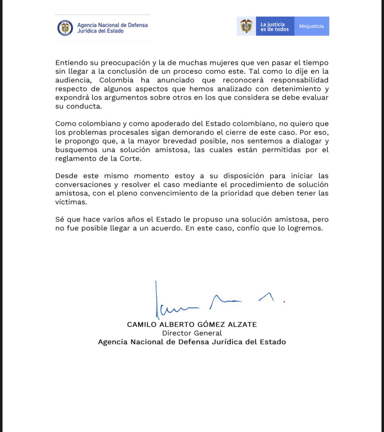 “Desde este mismo momento estoy a su disposición para iniciar las conversaciones y resolver el caso mediante el procedimiento de solución amistosa, con el pleno convencimiento de la prioridad que deben tener las víctimas del conflicto armado”, señaló.