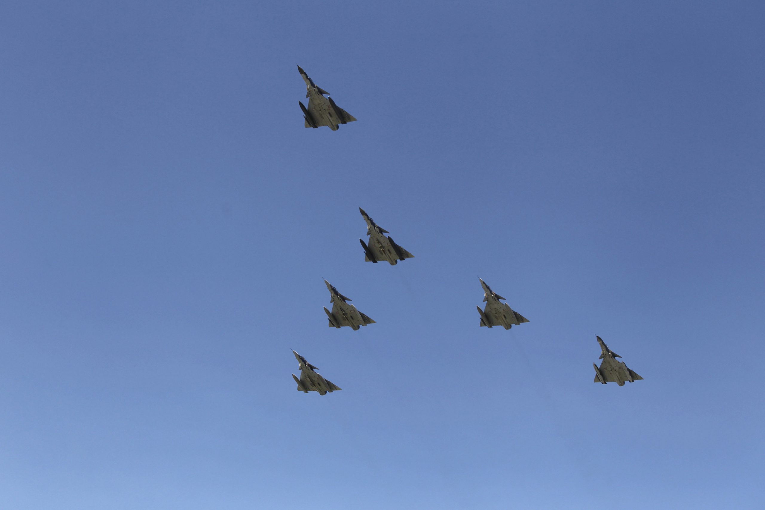 Aviones de combate Kfir vuelan durante una ceremonia para conmemorar el 94 aniversario de la Fuerza Aérea Colombiana en una base militar en Bogotá. REUTERS/John Vizcaino
