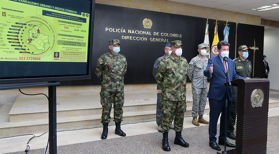 Molano ha señalado que «el impacto de las acciones terroristas» de los últimos días han dejado un policía muerto y más de 800 heridos, entre agentes y civiles, así como un gran número de infraestructuras públicas y negocios privados dañados, aunque no ha hecho referencia a los otros 18 fallecidos durante las manifestaciones.