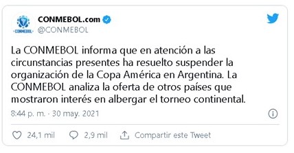 En un comunicado en su cuenta oficial de Twitter, la Confederación Sudamericana de Fútbol sostuvo que «en atención a las circunstancias presentes ha resuelto suspender la organización de la Copa América en Argentina. La CONMEBOL analiza la oferta de otros países que mostraron interés en albergar el torneo continental».