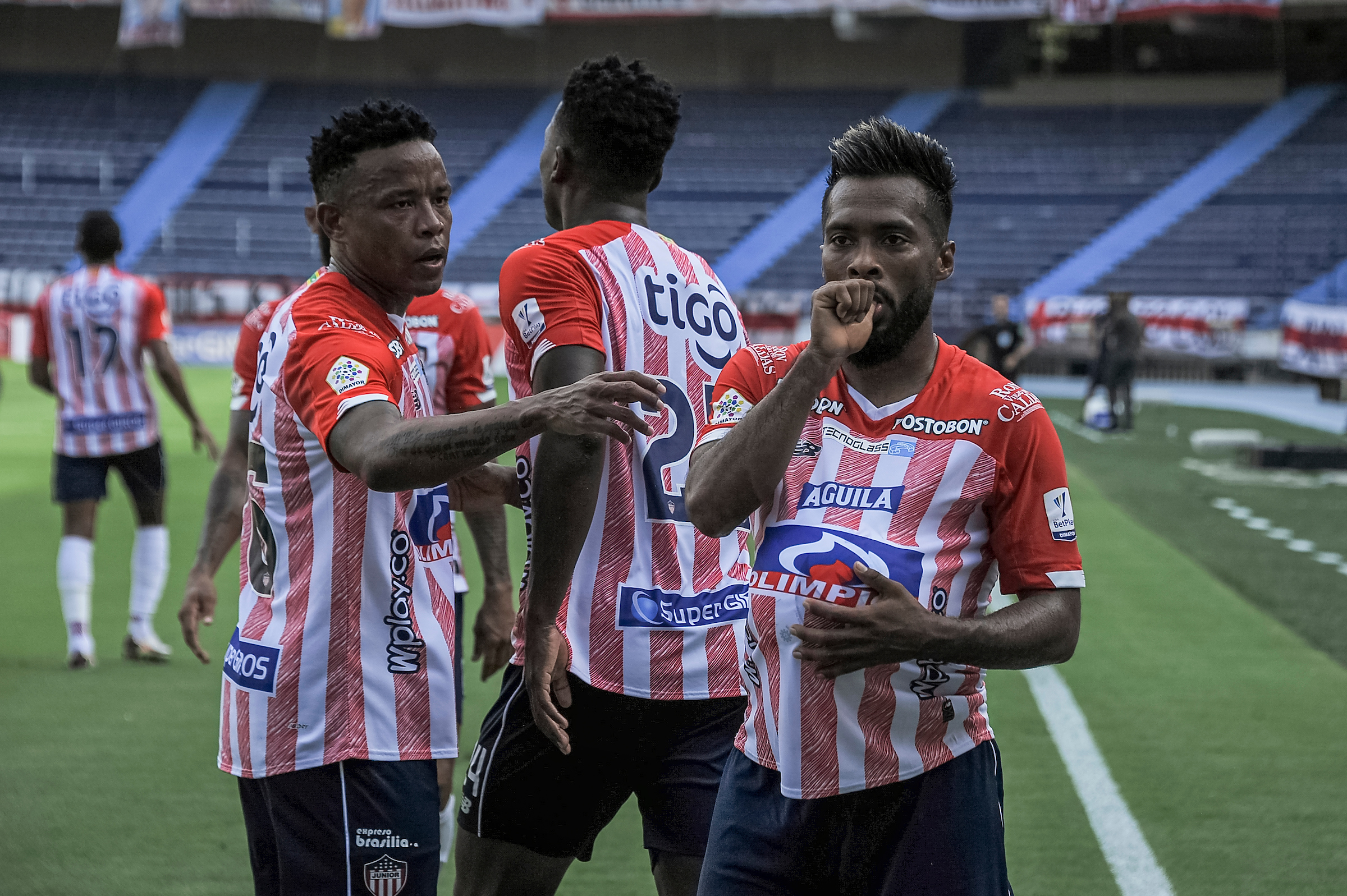 Freddy Hinestroza del Junior celebra después de anotar el primer gol de su equipo durante el partido por los cuartos de final, ida, como parte de la Liga BetPlay DIMAYOR I 2021 entre Atlético Junior e Independiente Santa Fe jugado en el estadio Metropolitano Roberto Meléndez de la ciudad de Barranquilla.Foto: VizzorImage / Jesus Rico / Cont