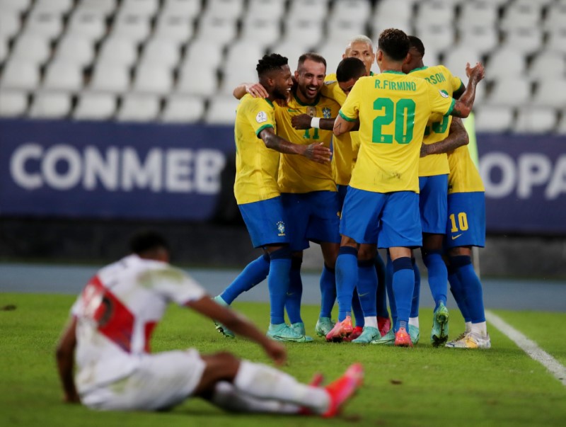 Jugadores de Brasil festejan uno de los goles con los que derrotaron 4-0 a Perú en Copa América. Estadio Nilton Santos, Río de Janeiro, Brasil. 17 de junio de 2021.