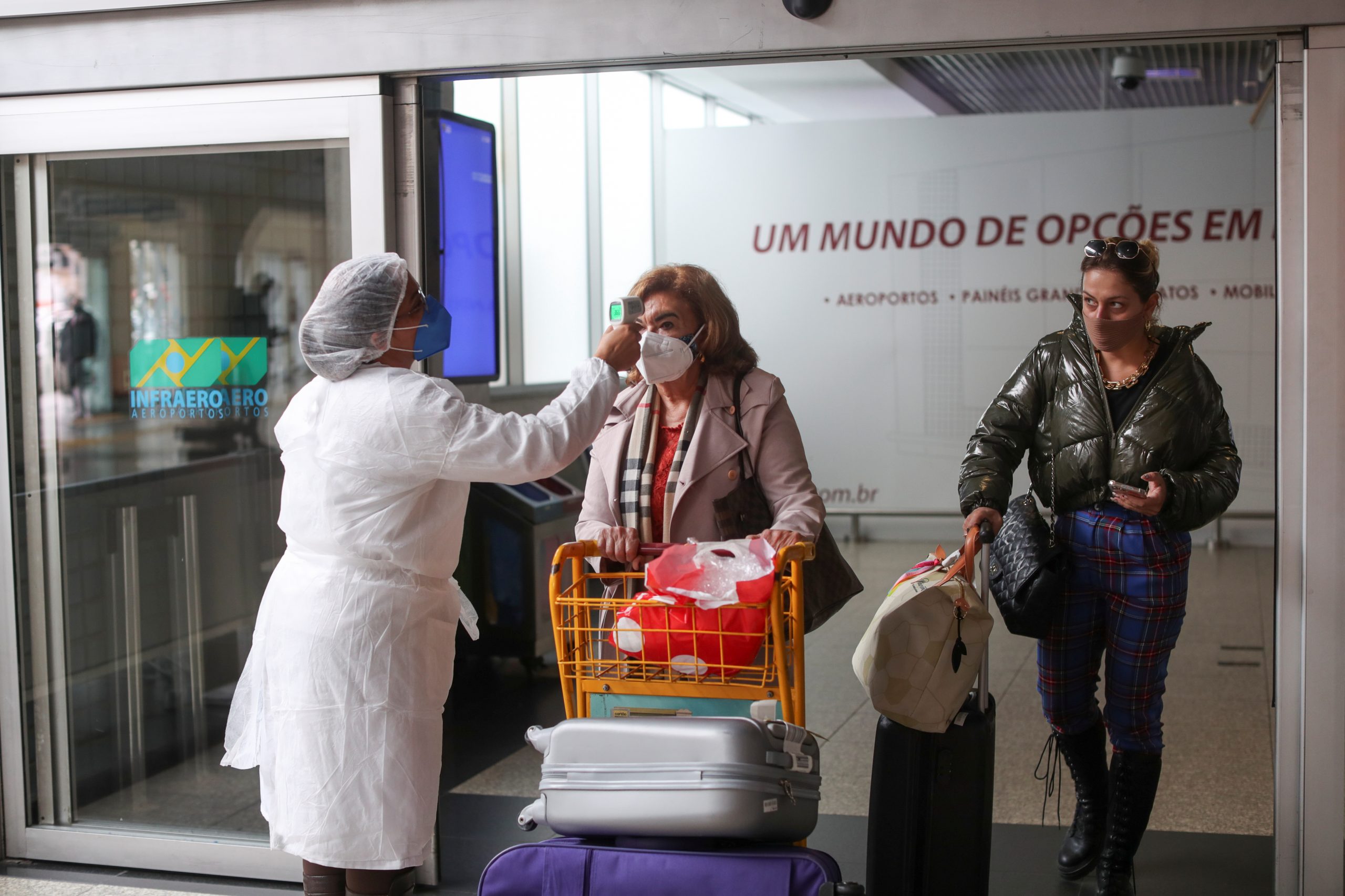 Una trabajadora de salud mide la temperatura de un viajero en una barrera sanitaria cuando llega al aeropuerto de Congonhas en Sao Paulo, Brasil, mayo de 2021. REUTERS/Amanda Perobelli