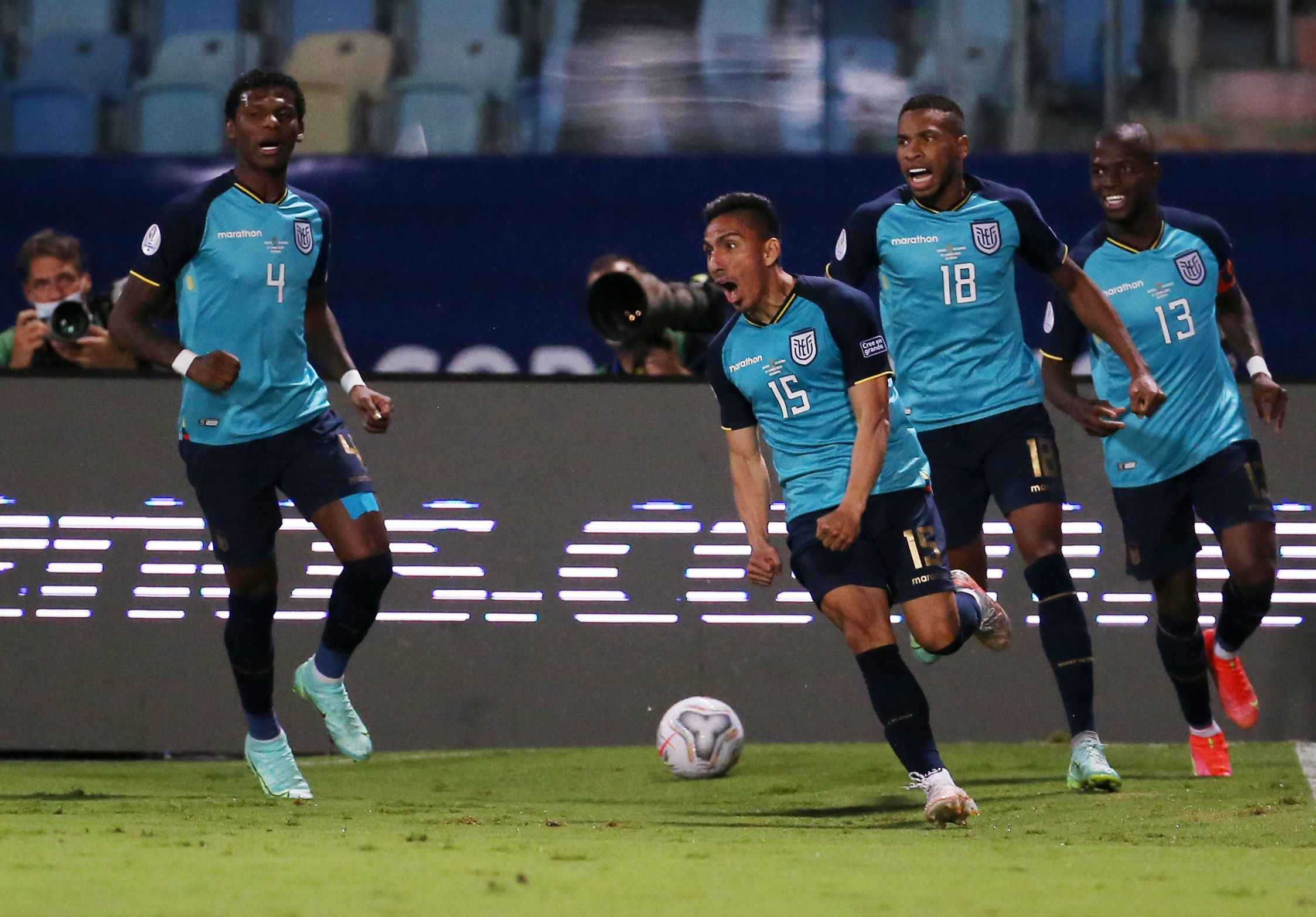 Ángel Mena celebra con sus compañeros el gol con el que Ecuador empató a Brasil y clasificó a cuartos de final en Copa América. Estadio Olímpico Pedro Ludovico, Goiania, Brasil. 27 de junio de 2021. REUTERS/Diego Vara