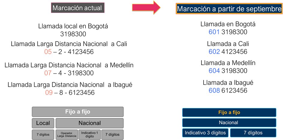 Ahora, tras la finalización de la fase inicial, el primero de septiembre de 2021 se iniciará la implementación del nuevo esquema de marcación. «A partir del cambio contemplado en la regulación, el país dispondrá́ de un esquema unificado en el que se marcarán 10 dígitos para hacer todo tipo de llamadas desde teléfonos fijos y celulares a cualquier número telefónico de Colombia».
