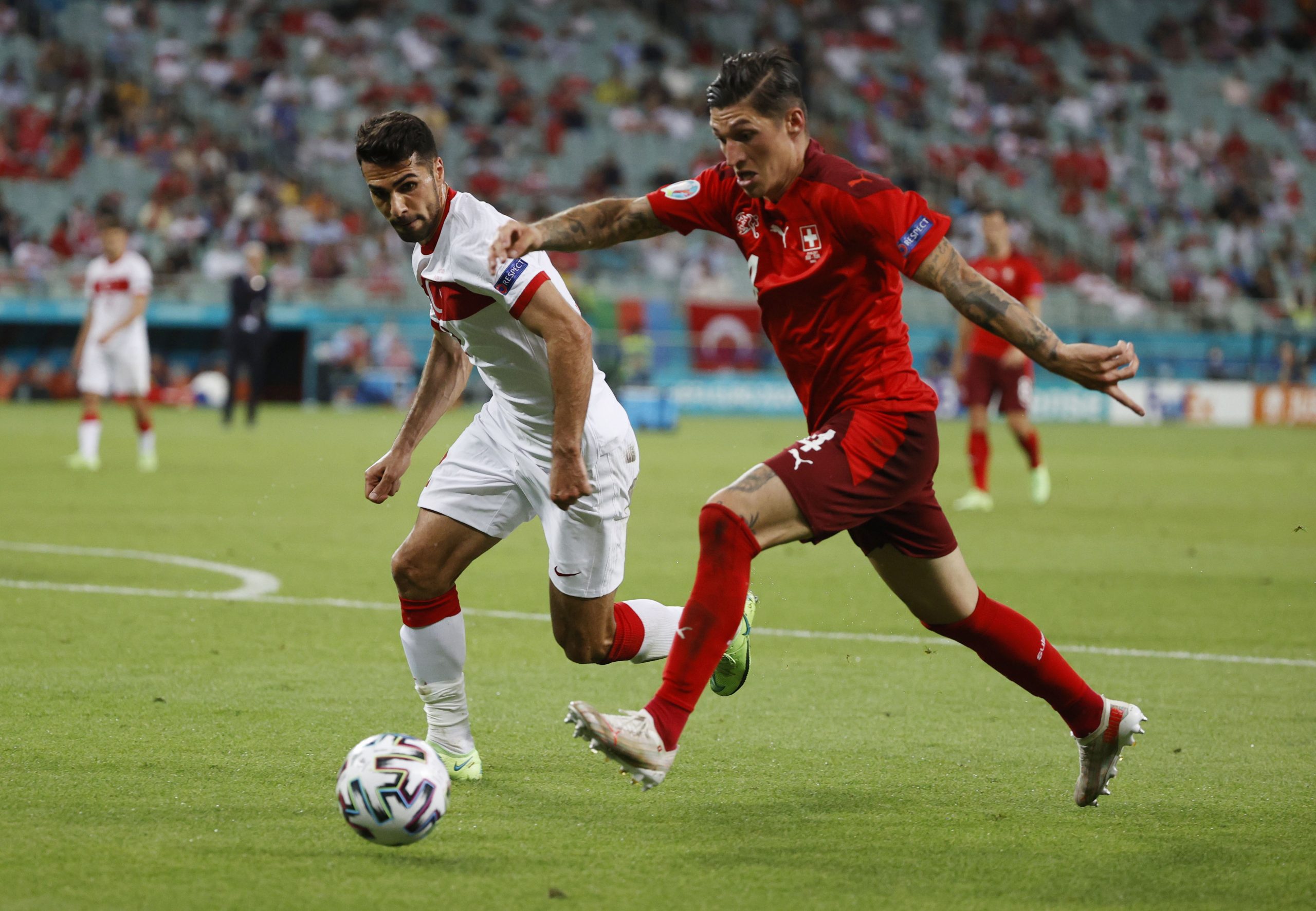 Steven Zuber de Suiza en acción frente a Zeki Celik de Turquía por el Grupo A de la Eurocopa 2020 en un partido disputado en el Estadio Olímpico de Bakú, en Bakú, Azerbaiyán. 20 de junio, 2021. Pool via REUTERS/Valentyn Ogirenko