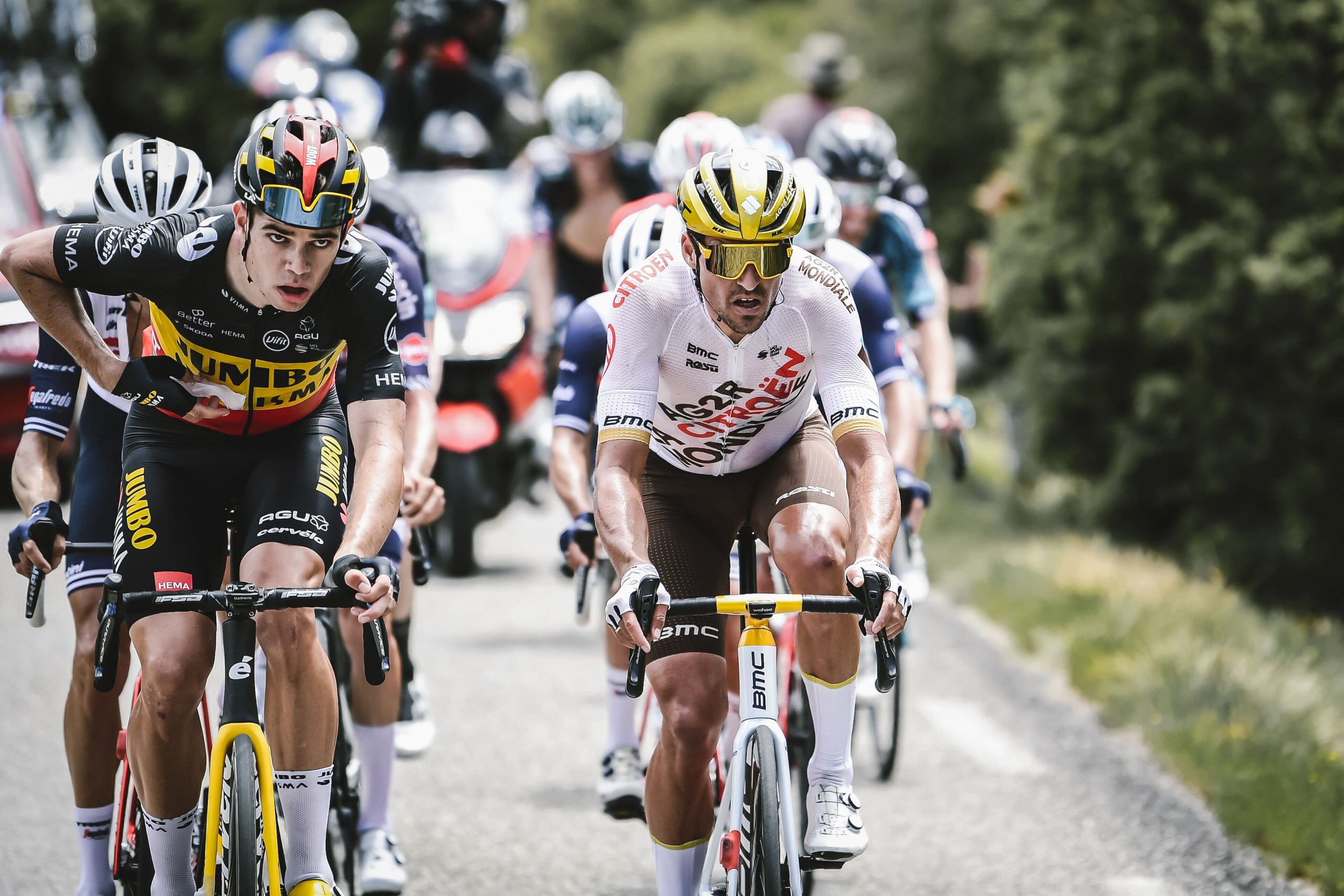 Vegard Stake Laengen (UAE Team Emirates), Wout van Aert (Jumbo-Visma), Julian Bernard, Kenny Elissonde, Bauke Mollema (Trek-Segafredo), Nils Politt (Bora-Hansgrohe), Xandro Meurisee, Kristian Sbaragli (Alpecin-Fenix), Greg van Avermaet, Benoît Cosnefroy (Ag2r-Citröen), Luke Durbridge (BikeExchange), Quentin Pacher (B&B Hotels-KTM) y Pierre-Luc Périchon (Cofidis) saltarían del pelotón en torno al kilómetro 50, de forma escalonada, y unirían fuerzas para cazar al grupo cabecero en el 99, ecuador de la etapa. Por detrás, el intenso ritmo propiciaba más de media docena de abandonos; el más notable, de Tony Martin (Jumbo-Visma) tras una dura caída en los compases iniciales de la etapa (km 25).