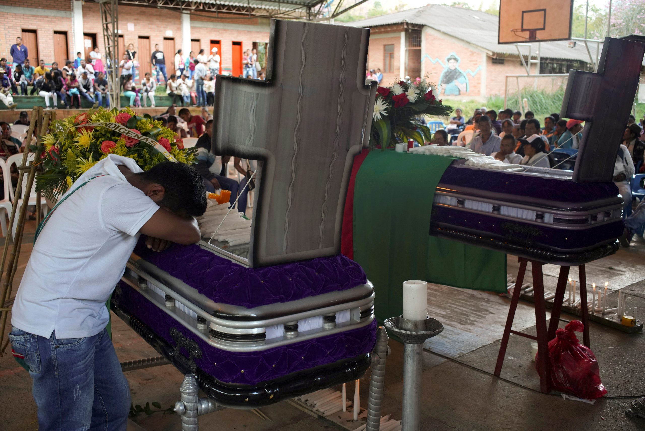 Miembros de la tribu indígena Nasa asisten al funeral de dos guardias indígenas asesinados por disidentes de las Fuerzas Armadas Revolucionarias de Colombia (FARC), según la Defensoría del Pueblo de Colombia, en Toribio, 2019. REUTERS/Federico Ríos