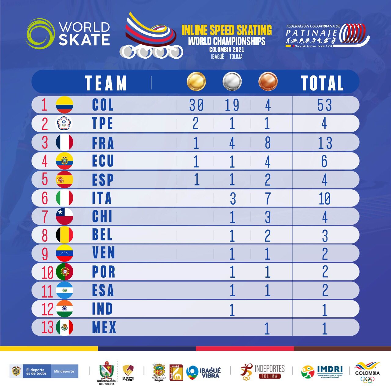 Colombia llegó a las 29 medallas de oro en el Mundial de Patinaje de Ibagué