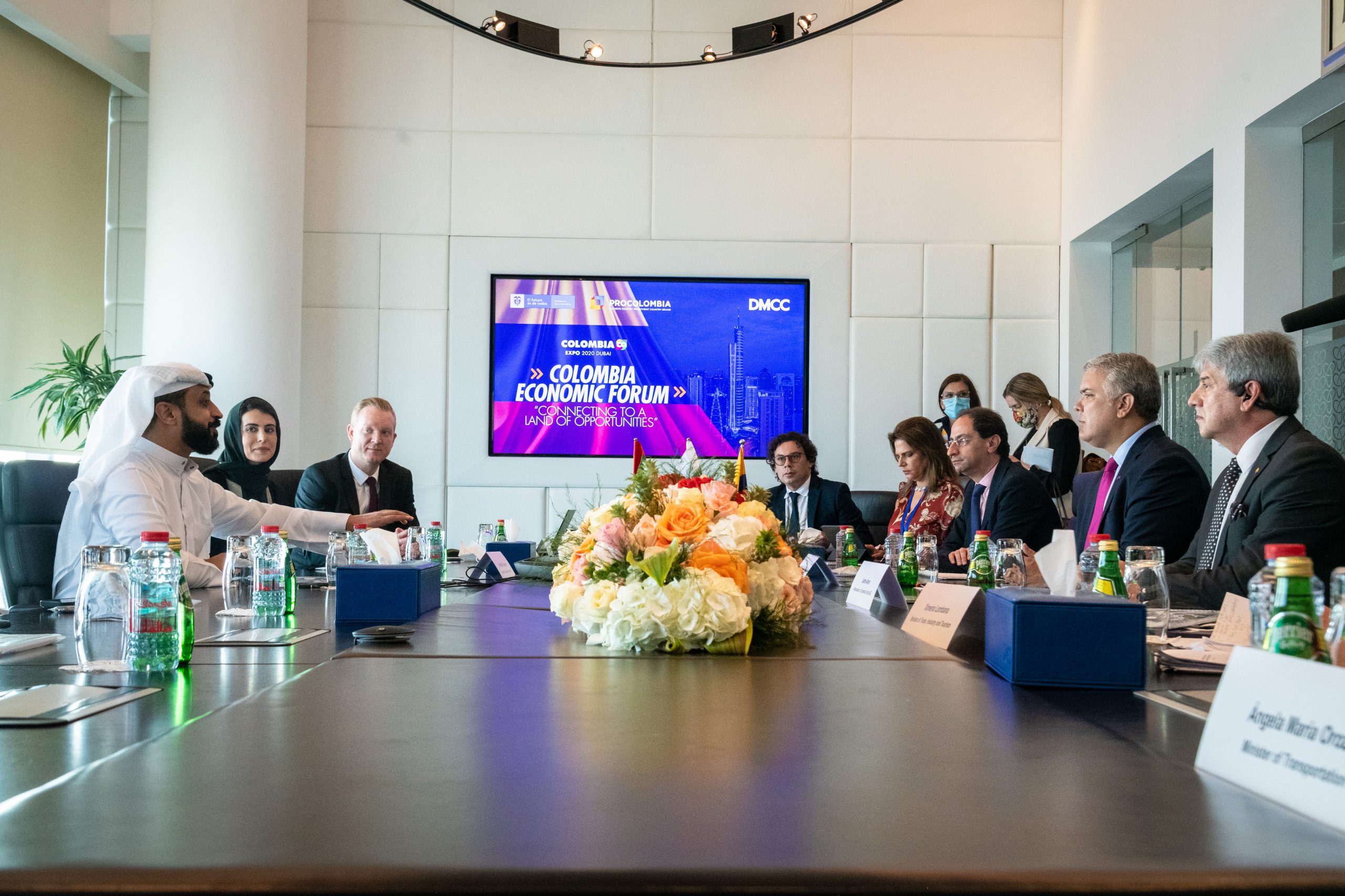 Acompañado por el Ministro de Hacienda, José Manuel Restrepo, la Directora de ProColombia, Flavia Santoro, y el Embajador Jaime Amín, el Presidente Duque sostuvo un encuentro con Ahmed Bin Sulayem, presidente de la Dubai Multi Commodities-. Foto: PRESIDENCIA