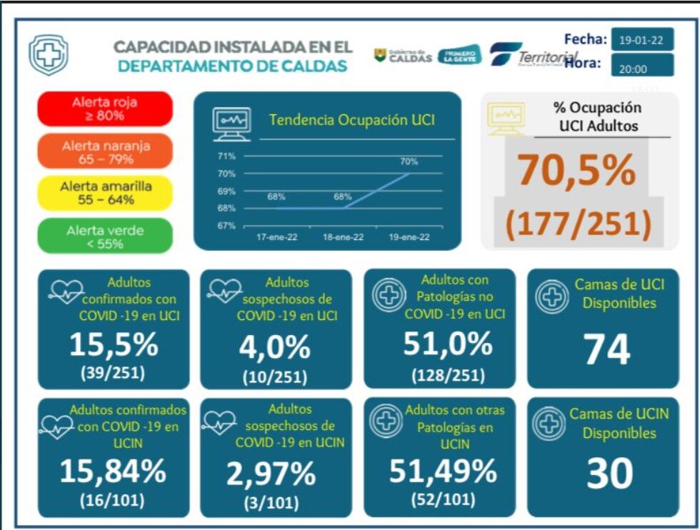 El director de la Territorial de Salud, médico Carlos Iván Heredia Ferreira, indicó que es precisamente este eficiente proceso de vacunación el que hace que la fase de aceleración sea de muchos positivos, pero pocas personas en Unidades de Cuidados Intensivos (UCI). «El departamento de Caldas cuenta con 251 camas UCI y de estas, el 69% están ocupadas, es decir, tenemos 79 camas disponibles, pero hay que hacer claridad en que solo el 13,5%, que representa 34 pacientes, son COVID confirmados; 11 son pacientes sospechosos, y 127, es decir, el 50,6%, son pacientes no COVID», aseguró el funcionario, quien ratificó que hoy el departamento tiene una oferta suficiente para responder a los caldenses.