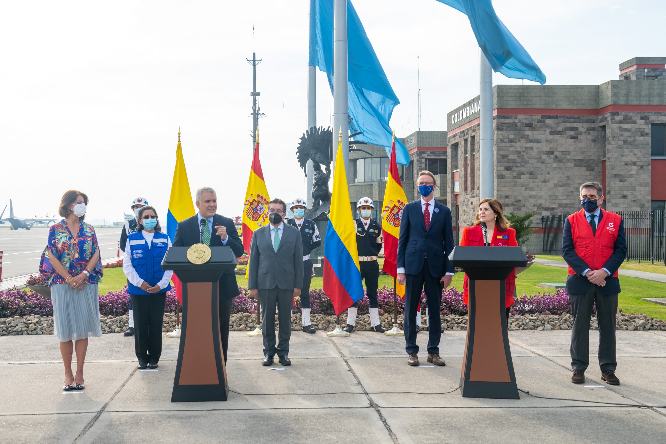 Este lote, que llegará al país de forma escalonada hasta el 8 de febrero, fue entregado por la Secretaria de Estado de Cooperación Internacional, Pilar Cancela Rodríguez, al Presidente de la República, Iván Duque, en un acto realizado en las instalaciones del Aeropuerto Militar de Catam.
