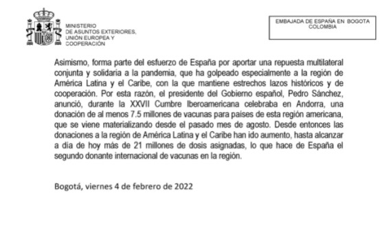 Con esta donación, España se convierte en el país que más donaciones de biológicos ha hecho a Colombia, en la medida en que con el nuevo lote que se recibe, más las dos entregas anteriores, la cifra de dosis que ha recibido el país llega a 7.546.420.